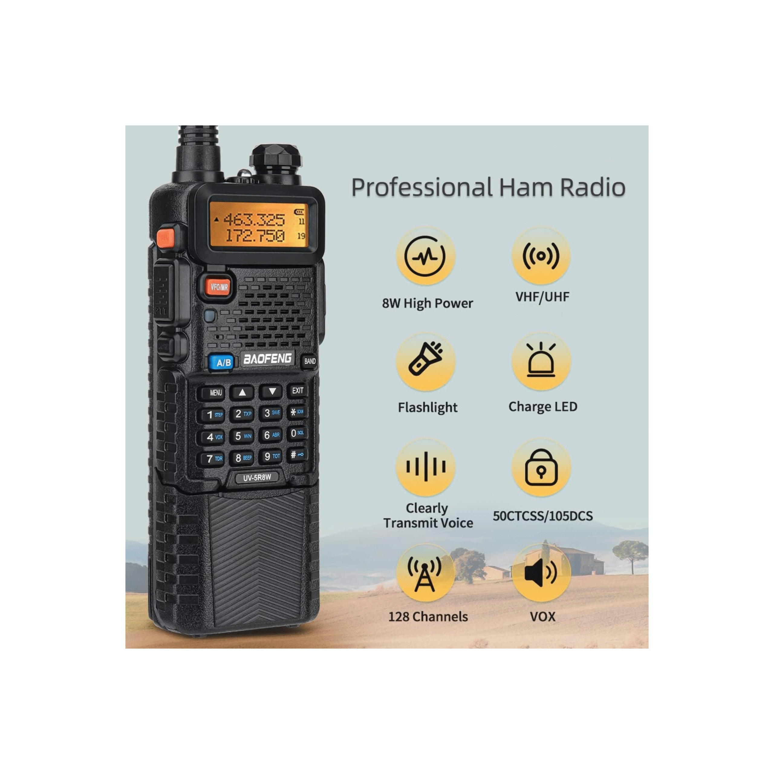 Professional Dual-Band Ham Radio – Features selectable High/Medium/Low TX power with up to 8 Watts maximum output. Equipped with dual band, dual display, and dual standby modes, plus 128 programmable channels, 50 CTCSS, and 104 CDCSS options. Includes auto keypad lock, built-in LED flashlight, and comes with FCC ID: 2AJGM-UV5R for compliance.